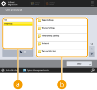 (Settings/Registration) to display the <Settings/Registration> screen. Press this key first to make changes for each setting, such as paper settings, display settings, and network settings. On this screen, you can also register destinations, such as e-mail addresses and fax numbers.