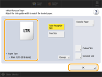 When changing the paper size and typeIf you load a different type of paper into the machine, make sure to change the settings. If you do not change the settings, the machine cannot print properly. Specifying Paper Size and Type in the Paper Deck/Drawer When changing the paper size, change the paper size label as necessary. (Attaching the appropriate paper size label) Note that the paper size label may include paper sizes which are unavailable on the machine. |
