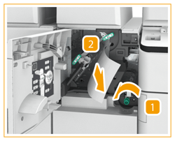 After you remove jammed long paper and then close the front cover of the insertion unit, a screen may appear prompting you to open the front cover of the Paper Folding Unit-K. You can make this screen disappear by opening and then closing the front cover of the Paper Folding Unit-K.