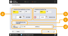 You cannot configure the settings for the Fax Activity Report while <Display Job Log> in <Management Settings> is set to <Off>. In addition, if you change <Display Job Log> in <Management Settings> from <Off> to <On>, <Print/Send Every Specified No. of Transm.> and <Print/Send at Specified Time> in the Fax Activity Report automatically changes to <Off>. <Display Job Log> |