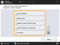 Si <Raccourci Réglages/Enreg.> ne s'affiche pas sur l'écran <Accueil>, appuyez sur   <Réglages de gestion d'accueil> <Restreindre l'affichage des fonctions>   <Régler> définissez <Raccourci Réglages/Enreg.> pour l'afficher.