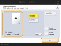 Changement du format et du type de papierSi vous chargez un autre type de papier dans l'appareil, assurez-vous de changer le réglage. Si vous ne changez pas le réglage, l'appareil ne peut pas imprimer correctement. Spécification du format et du type de papier dans le magasin/la cassette à papier Lorsque vous changez le format de papier, pensez à changer également l'étiquette de format de papier. (Apposition de l'étiquette du format de papier approprié) Veuillez noter que l'étiquette de format de papier peut indiquer des formats qui ne sont pas disponibles sur l'appareil. |