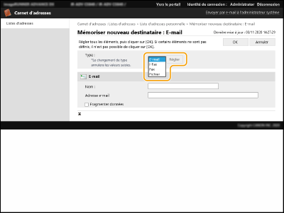 4 | Enregistrez les informations nécessaires et cliquez sur [OK]. Les éléments affichés varient en fonction du type de destination. Pour plus d'informations sur les informations à enregistrer, voir Enregistrement de destinataires dans le carnet d'adresses. |