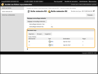 ![]() | Vous pouvez utiliser l'interface utilisateur distante pour imprimer, envoyer ou supprimer des fichiers qui sont stockés dans la boîte courrier ou des fax et I-faxes qui sont temporairement stockés dans la boîte courrier Fax/I-Fax. |