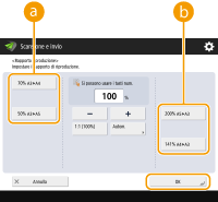 Se si imposta la modalità a colori su <Autom. (Colore/Grigio)>, <Autom. (Colore/B&N)>, <Colore> o <Scala di grigi>, è possibile inviare solo documenti come rapporto di riproduzione (zoom) del 100%. Tuttavia, se sono impostati come destinazioni solo indirizzi I-fax, è possibile modificare il rapporto di riproduzione indipendentemente dalla modalità a colori.