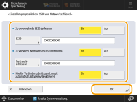 Drücken Sie <Einstellungen persönliche SSID und Netzwerkschlüssel>, geben Sie einen persönlichen SSID-/Netzwerkschlüssel ein und drücken Sie <OK>.