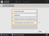 Bildschirm festlegen, der nach Start des Geräts angezeigt wirdWenn das Gerät so konfiguriert ist, dass Anwender sich beim Start anmelden müssen ( Festlegen, wann das Anmeldefenster angezeigt werden soll), wird <Standardanz. bei Startup/Wiederherstellung> als Element in <Persönliche Einstellungen> angezeigt. Der nach dem Gerätestart angezeigte Bildschirm kann für jeden Anwender festgelegt werden. |