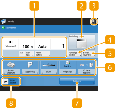 Ändern Sie das Grundfunktionsdisplay zum Kopieren in den Express-Kopierbildschirm, um schnell auf die einzelnen Einstellungselemente zugreifen zu können. Schnelles Ändern der Einstellungen (Express Kopierbildschirm) |