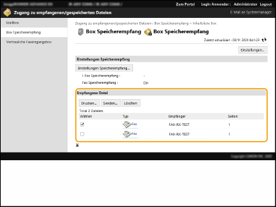 ![]() | Sie können Remote UI verwenden, um in der Mailbox gespeicherte Dateien bzw. vorübergehend in der Fax/I-Fax Eingangsbox gespeicherte Faxe und I-Faxe zu drucken, zu senden oder zu löschen. |