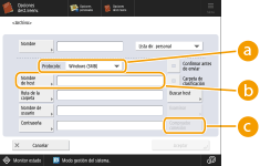 1 | Escriba el nombre de host del servidor de archivos/Espacio avanzado que transmite los datos. ![]() Pregunte a su Administrador de red acerca de la información en el servidor de archivos/Espacio avanzado. <Protocolo>Seleccione un protocolo para el servidor de archivos de entre <Windows (SMB)>, <FTP> y <WebDAV>. Al enviar un documento al Espacio avanzado, seleccione <Windows (SMB)> o <WebDAV>. ![]() Si selecciona <Windows (SMB)>, aparecerán los botones <Buscar host> y <Examinar>. Puede especificar fácilmente un servidor de archivos/Espacio avanzado buscando o visualizando la red. Solo se puede utilizar <Examinar> si <1.0> se ha establecido como <Sí> en <Especifique la versión del cliente SMB>. Puede registrar hasta cinco servidores de directorio utilizados en <Examinar>. <Nombre de host>Escriba el nombre de host del servidor de archivos/Espacio avanzado. Si selecciona <FTP> como protocolo, escriba el <Nombre de host> de la manera siguiente. Cuando TLS está deshabilitado Ejemplo: Para guardar en el Espacio compartido: ftp://nombre de host/share Para guardar en el Espacio personal: ftp://nombre de host/users Cuando TLS está habilitado Ejemplo: Para guardar en el Espacio compartido: ftps://nombre de host/share Para guardar en el Espacio personal: ftps://nombre de host/users Al enviar un documento al Espacio avanzado, introduzca <Nombre de host> como se indica a continuación. Si selecciona <Windows (SMB)> para el protocolo Ejemplo: Para guardar en el Espacio compartido: \\192.168.100.50\share Para guardar en el Espacio personal: \\192.168.100.50\users Si selecciona <WebDAV> para el protocolo Cuando TLS está deshabilitado Ejemplo: Para guardar en el Espacio compartido: http://<dirección IP o nombre de host> Para guardar en el Espacio personal: http://<dirección IP o nombre de host> Cuando TLS está habilitado Ejemplo: Para guardar en el Espacio compartido: https://<dirección IP o nombre de host> Para guardar en el Espacio personal: https://<dirección IP o nombre de host> <Compruebe conexión>Pulse este botón después de escribir el nombre de host para confirmar la conexión con el servidor de archivos/Espacio avanzado. ![]() Si está utilizando un servicio de inicio de sesión como la gestión de autenticación personal, debe introducir el <Nombre de usuario> y la <Contraseña>. |