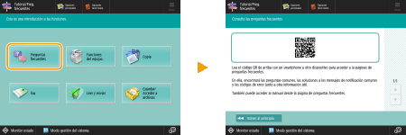 Ver la guía de funciones y la página de preguntas frecuentesPulse <Tutorial/Preg.frecuentes> para ver una pantalla que explica lo que puede hacer con las funciones del equipo, así como consejos de uso de la copiadora, el escáner, etc. Puede ver esta pantalla cuando desee saber más sobre las funciones disponibles y cómo utilizarlas. También puede acceder a la página de preguntas frecuentes desde un dispositivo móvil. ![]() Ejemplo 1: Tutorial de funciones de copia Al seleccionar un elemento de la lista, aparece la pantalla del tutorial. ![]() Ejemplo 2: Visualización de la página de preguntas frecuentes Al pulsar<Preguntas frecuentes>, aparece un código QR. Puede visualizar la página de preguntas frecuentes sobre el equipo leyendo este código QR en un dispositivo móvil como un smartphone o tableta. ![]() Utilice la función de AyudaSegún la función que se muestra, a veces aparece en la parte superior derecha de la pantalla. Pulse para consultar la descripción y el método de funcionamiento de la función.![]() Pulse <Fin> para volver a la pantalla anterior. Utilizar del mismo modo que con un smartphone (desplazar/pellizcar/arrastrar y soltar)En algunas pantallas puede cambiar de página o deslizarse desplazando el dedo arriba/abajo o a izquierda/derecha sobre la pantalla como lo haría con un smartphone. ![]() También puede acercar o alejar la pantalla utilizando dos dedos para pellizcar hacia fuera o hacia dentro. Puede arrastrar la pantalla ampliada con el dedo. Personalización del aspecto de la pantalla y las condiciones operativas. ![]() Si <Permitir ampliación de pantalla> se ha ajustado en <Sí>, toda la pantalla se acerca o se aleja cuando se pellizca en la pantalla de vista preliminar. Si <Permitir ampliación de pantalla> se ha ajustado en <No>, solo se acercará o se alejará la imagen de vista preliminar.