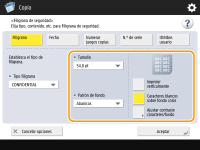 Al copiar documentos que incluyen información confidencial, puede integrar texto invisible, tal como "TOP SECRET" o "CONFIDENCIAL" para avisar a los usuarios no autorizados de que no deben copiarlos. Al copiar un documento que ya se ha copiado, el texto integrado aparece en toda la página para evitar copias no autorizadas de copias. Opciones del sistema