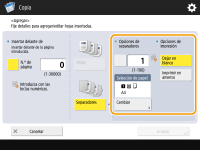 Especifique la página para insertar el papel separador, configure el número de hojas y seleccione si desea imprimir en el papel separador. Si desea imprimir en el papel separador, incluya el original que se va a imprimir en el separador en el documento original.