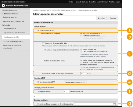 Especifique el límite de tiempo para intentar conectarse al servidor de autenticación y el tiempo límite de espera para obtener respuesta. Si está habilitado [Guardar información de autenticación para usuarios de inicio de sesión] y no puede iniciar sesión en el límite de tiempo aquí especificado, se intentará iniciar sesión utilizando la información de autenticación guardada en la caché.