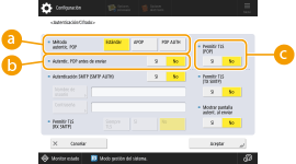 2 | Especifique cada elemento. ![]() <Autenticación SMTP (SMTP AUTH)>Para utilizar la autenticación SMTP, pulse <Sí>, introduzca el nombre de usuario y la contraseña de las cuentas de correo especificadas en <Nombre de usuario> y <Contraseña>. ![]() Nombre de usuario y contraseña También se utilizan el <Nombre de usuario> y la <Contraseña> para la <Autenticación SMTP> cuando se reenvían los documentos recibidos. El reenvío se realiza como "Autenticación de dispositivos fijos" independientemente de la configuración de <Inf. usada para autenticación servidor SMTP>. (<Inf. usada para autenticación servidor SMTP>) <Permitir TLS (RX SMTP)>Para codificar la comunicación mediante TLS al recibir I-faxes y correos electrónicos mediante el servidor SMTP, pulse <Siempre TLS> o <Sí>. Si no desea recibir datos que no estén codificados, seleccione <Siempre TLS>. <Mostrar pantalla autent. al enviar>Al enviar correos electrónicos e I-faxes, para ver la pantalla de introducción del nombre de usuario y la contraseña, pulse <Sí>. <Permitir TLS (TX SMTP)>Para codificar la comunicación del/al servidor SMTP mediante TLS, pulse <Sí>. Si está establecido <Sí>, puede confirmar el certificado del servidor TLS durante la comunicación con el servidor y añadir CN a los elementos de verificación. <Confirmar certificado TLS para TX SMTP> ![]() Cuando se ajuste la autenticación SMTP Especifique el método de autenticación con uno de los tres métodos siguientes. Autenticación de dispositivos fijos Introducción de los datos de autenticación al enviar Registro de la información para cada usuario Autenticación de dispositivos fijos: cuando se utilizan el <Nombre de usuario> y la <Contraseña> introducidos en <Autenticación SMTP (SMTP AUTH)> y no se muestra la pantalla de autenticación (<Iniciar sesión en servidor SMTP>) al realizar el envío Especifique los ajustes como se indica a continuación. <Autenticación SMTP (SMTP AUTH)>: <Sí> <Nombre de usuario>: introduzca el nombre de usuario. <Contraseña>: introduzca la contraseña. <Mostrar pantalla autent. al enviar>: <No> <Inf. usada para autenticación servidor SMTP>: <Opciones de dispositivo> Introducción de los datos de autenticación al enviar: cuando se introducen el <Nombre de usuario> y la <Contraseña> en <Autenticación SMTP (SMTP AUTH)> y se muestra la pantalla de autenticación (<Iniciar sesión en servidor SMTP>) al realizar el envío El <Nombre de usuario> y la <Contraseña> introducidos en <Autenticación SMTP (SMTP AUTH)> se introducen como información de autenticación al realizar el envío. Cuando no se introducen (se dejan en blanco) el <Nombre de usuario> y la <Contraseña> para la <Autenticación SMTP (SMTP AUTH)>, también se deja en blanco la información al enviar. Especifique los ajustes como se indica a continuación. <Autenticación SMTP (SMTP AUTH)>: <Sí> <Nombre de usuario>: introduzca el nombre de usuario. <Contraseña>: introduzca la contraseña. <Mostrar pantalla autent. al enviar>: <Sí> <Inf. usada para autenticación servidor SMTP>: <Opciones de dispositivo> Registro de la información para cada usuario: cuando se utiliza <Inf. guardada p/cada usuar> y la pantalla de autenticación (<Iniciar sesión en servidor SMTP>) no se muestra al enviar La autenticación SMTP se realiza con el nombre de usuario y la contraseña registrados en el dispositivo local. Especifique los ajustes como se indica a continuación. <Autenticación SMTP (SMTP AUTH)>: <Sí> <Mostrar pantalla autent. al enviar>: <No> <Inf. usada para autenticación servidor SMTP>: <Inf. guardada p/cada usuar> |