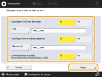 Pulse <SSID personal y Opciones de claves de red>, especifique un SSID y clave de red personales, y pulse <Aceptar>.