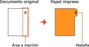 Si se selecciona <Imprimir en ambas caras> para la tapa delantera en <Portada> y se establece el papel separador para que se inserte en el anverso de la primera página, la tapa frontal se reproduce primero y, a continuación, se genera el papel separador. La tapa frontal se produce como un papel en blanco y las copias se realizan a partir de este papel separador. Si selecciona <Dejar en blanco> para la inserción de hojas, puede configurar una hoja y un papel separador en la misma página. En este caso, el papel para la inserción de hojas sale primero y, a continuación, el papel separador. Al imprimir en el separador, coloque el original como en la ilustración siguiente. No disponga caracteres innecesarios ni imágenes en el área del separador. |