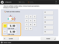 Pulse <X> o <Y> para introducir la longitud de cada cara mediante las teclas numéricas. ![]() Si registra el tamaño de papel que utiliza con más frecuencia en los botones <S1> a <S5>, puede recuperarlo con un solo toque. Registrar papel de tamaño libre (Tamaño de papel personalizado) | |