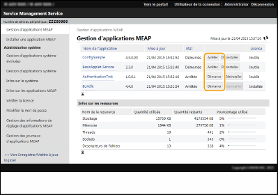 Si vous cliquez sur le bouton [Démarrer] / [Arrêter], situé à droite de l'état de fonctionnement, vous pouvez démarrer ou arrêter l'application MEAP.