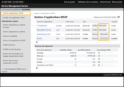 En plus de vérifier les détails et de modifier les réglages, vous pouvez mettre les applications MEAP au niveau supérieur ou désinstaller les applications en utilisant le SMS de l'interface utilisateur distante.