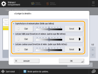 Lorsque vous déplacez le curseur vers <Foncé>, les zones imprimées de densité maximale sont renforcées. Lorsque vous déplacez le curseur vers <Faible>, les zones remplies, le texte et les lignes sont imprimées comme des demi-teintes en utilisant moins de points. Ce réglage s'utilise surtout pour ajuster les densités intermédiaires.