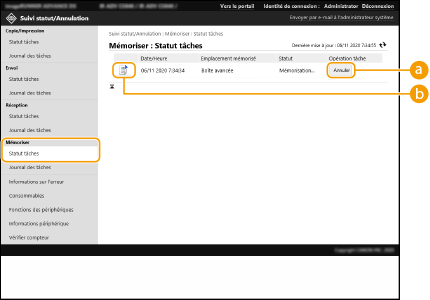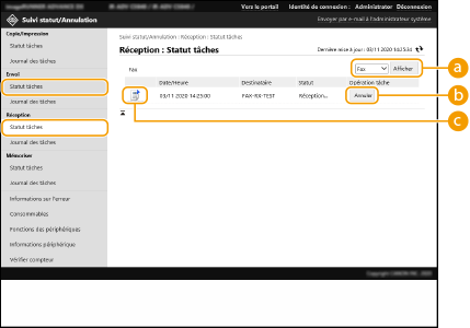 Vous pouvez vérifier les statuts des fax et des e-mails qui sont en attente pour être envoyés, des fax qui ont été reçus et des fax en attente de transmission. Vous pouvez aussi annuler le processus d'envoi et de réception des documents.