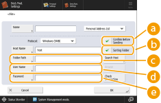 Se você tentar enviar para um servidor de arquivos/Advanced Box em que <Confirm Before Sending> está configurado como <On>, uma tela será exibida solicitando um nome de usuário e senha. Nesse caso, insira a senha previamente configurada. Se deseja registrar um servidor de arquivos/Advanced Box em um endereço de grupo, configure <Confirm Before Sending> como <Off>. Você não pode enviar a um endereço de grupo incluindo um servidor de arquivos/Advanced Box em que <Confirm Before Sending> está configurado como <On>.
