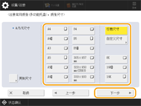 1 | 按<自定义尺寸>。 ![]() 您可以将纸张尺寸指定为 <任意尺寸>,这样就不必再输入纸张尺寸设置。在添加未知尺寸的纸张用于复印时或纸张尺寸已经在打印机驱动程序中注册时指定 <任意尺寸>。 |