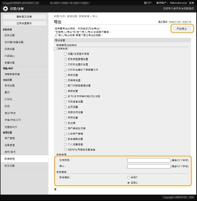 可以从本机导出所有设置数据并将其保存到计算机,然后在新的机器上配置设置时将其导入,如购买更换产品时。如果要在两台或多台Canon多功能打印机*上配置相同的设置,只需从一台机器导出所有设置并将其导入至其他机器,无需分别配置每台机器。要执行这些操作,请以“管理员”权限登录到“远程用户界面”。