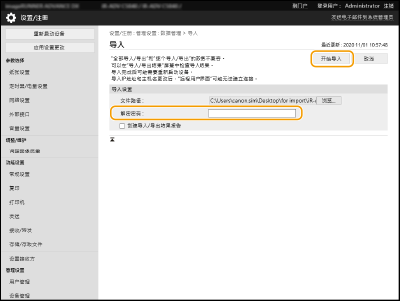 导入已导出的设置数据时,将需要在[加密密码]中输入的密码。使用字母数字字符。