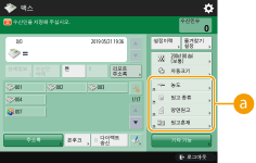 기본 특징 화면에 있는 설정 항목의 수와 표시될 위치는 기능에 따라 달라집니다. <할당없음>을 단축키로 설정하면 단축키 버튼이 표시되지 않습니다. 등록할 수 있는 <기타 기능>에 대한 단축키의 수는 다음과 같이 제한됩니다. 복사(기본): 5 복사(고속): 6 팩스: 4 스캔 및 전송: 2 복사 기본 특징 화면을 고속 복사 화면(설정을 빠르게 변경(고속 복사 화면))으로 변경했으면 3단계의 버튼을 선택하고 <등록>을 누릅니다. |