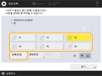 <수동급지대 용지의 기본 설정>에서 <매회 지정모드>를 <자주 사용하는 용지>로 설정하면 수동 급지대에 용지를 넣을 때 해당 "자주 사용하는 용지"를 선택할 수 있게 해주는 화면이 표시됩니다.<수동 급지대 기본설정 등록> |