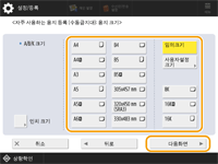 1 | <사용자설정 크기>을 누릅니다. ![]() 용지 크기를 <임의크기>로 설정할 수 있으며 용지 크기 설정을 입력할 필요가 없어집니다. 복사에 사용하기 위해 알려지지 않은 크기의 용지를 넣거나 용지 크기가 이미 프린터 드라이버에 등록되어 있는 경우 <임의크기>를 지정합니다. |