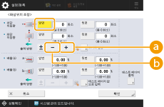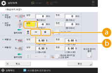 1 | <화상위치 조정> 화면에서 <배율 (a)> 및 <배율 (b)>에 대해 확대/축소 비율(%)을 설정하고  <OK>를 누릅니다. <배율 (a)>입력된 비율에 따라 이송 방향과 평행한 방향으로 이미지를 확대하거나 축소합니다. <배율 (b)>입력된 비율에 따라 이송 방향과 수직 방향으로 이미지를 확대하거나 축소합니다. 필요에 따라 테스트 페이지 용지를 다시 인쇄한 다음 보정 크기를 확인합니다. |
