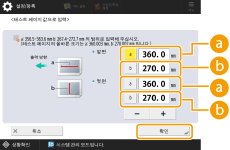 3 | 앞면 및 뒷면에서 테스트 페이지의 길이를 입력하고  <확인>을 누릅니다. 예를 들어 <a>의 측정 길이가 360.4mm인 경우 360.4를 입력합니다. 이미지가 올바른 크기로 인쇄되도록 길이의 차이(이 경우 0.4mm)가 자동으로 줄어듭니다. <a>테스트 페이지에서 <a> 표시의 측정 길이를 입력합니다. <b>테스트 페이지에서 <b> 표시의 측정 길이를 입력합니다. 필요에 따라 테스트 페이지를 다시 인쇄한 다음 보정 크기를 확인합니다. |