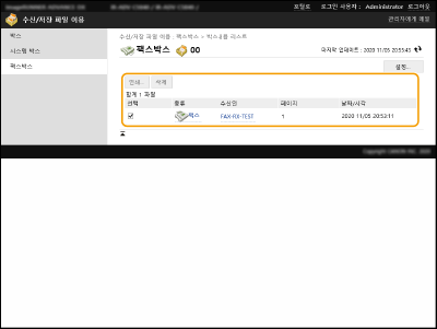![]() | 리모트 UI를 사용하여 메일함에 저장된 파일 및 팩스/I-팩스 받은 편지함에 임시 저장된 팩스와 I-팩스의 인쇄, 전송 또는 삭제 작업을 할 수 있습니다. |