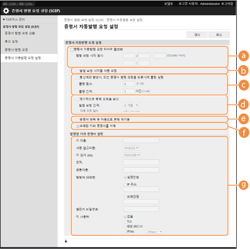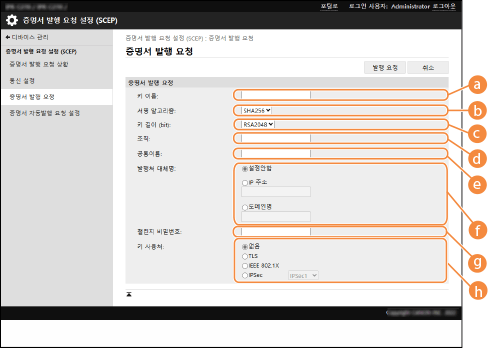 기기를 통해 생성된 키에 필요한 인증서 발행 요청을 인증서를 관리하는 SCEP(간단 인증서 등록 프로토콜) 서버로 보낼 수 있습니다. SCEP 서버에서 발행된 인증서가 자동으로 등록됩니다. 인증서 발행 요청을 보내려면 Administrator 권한이 필요합니다.