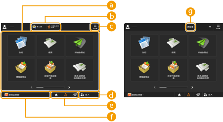 這些按鈕可讓您開啟基本功能畫面,例如「影印」和「掃描後傳送」。