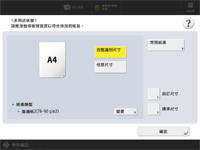 1 | 按 <自訂尺寸>。 ![]() 您可將紙張尺寸指定為 <任意尺寸>,如此就不必輸入紙張尺寸設定。裝入要用於影印的未知尺寸紙張或紙張尺寸已經在印表機驅動程式中註冊時,請指定 <任意尺寸>。 |