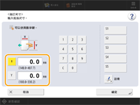 使用數字鍵按 <X> 或 <Y> 輸入各邊的長度。 ![]() 如果將按鈕 <S1> 的常用紙張尺寸註冊到 <S5>,只要按一下即可叫用。註冊尺寸不限的紙張(自訂尺寸紙張) | |