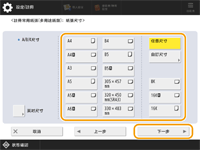 1 | 按 <自訂尺寸>。 ![]() 您可將紙張尺寸指定為 <任意尺寸>,如此就不必輸入紙張尺寸設定。裝入要用於影印的未知尺寸紙張或紙張尺寸已經在印表機驅動程式中註冊時,請指定 <任意尺寸>。 |