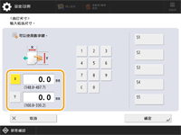 使用數字鍵按 <X> 或 <Y> 輸入各邊的長度。 ![]() 如果將按鈕 <S1> 的常用紙張尺寸註冊到 <S5>,只要按一下即可叫用。註冊尺寸不限的紙張(自訂尺寸紙張) | |