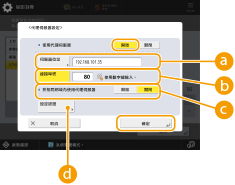 將 <使用代理伺服器> 設定為 <開啟>,指定必要的設定,然後按 <確定>。