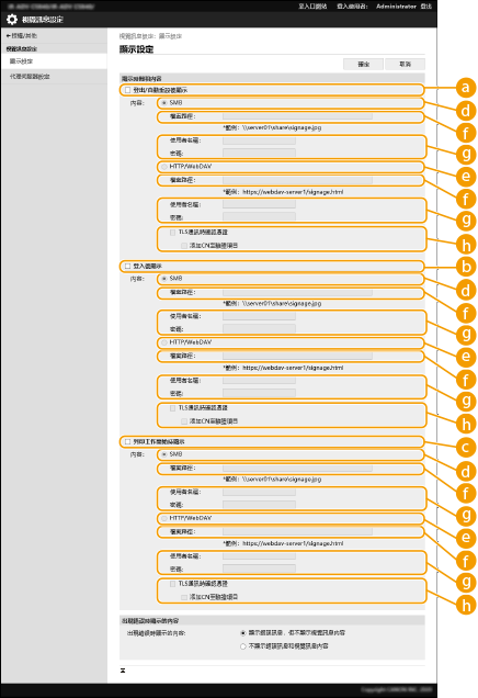 [顯示內容時通知伺服器登入資訊]勾選此核取方塊可在使用者顯示視覺訊息並輸入網路伺服器路徑時,將使用者資訊(使用者名稱和網域名稱)發佈到網路伺服器。