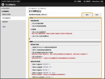 與資訊安全性相關的本機設定可以按批次方式套用和管理。建議負責管理您安全策略的資訊安全性管理員依照您組織的策略,將安全策略套用到本機上。若要指定安全策略,請使用管理員權限登入遠端使用者介面。