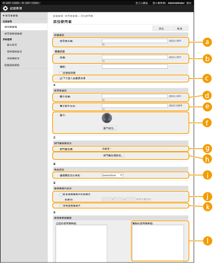 dc | 否 | 0 至 32 個字元 | 控制字元 | - (N/A) | 無法變更。為下列使用者自動指派。 按照伺服器認證註冊的使用者 透過圖片登入中的 <工作接收時自動註冊> 註冊的使用者 |