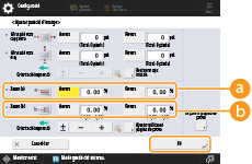 1 | Establiu l'escala d'ampliació/reducció (%) per a <Zoom (a)> i <Zoom (b)> en <Ajustar posició d'imatge> la pantalla  premeu <Bé>. <Zoom (a)>Amplia o redueix la imatge en direcció paral·lela a la direcció d'alimentació segons l'escala d'entrada. <Zoom (b)>Amplia o redueix la imatge en direcció perpendicular a la direcció d'alimentació segons l'escala d'entrada. Segons calgui, torneu a provar d'imprimir el paper de la pàgina de prova i després comproveu-ne la quantitat de correcció. |