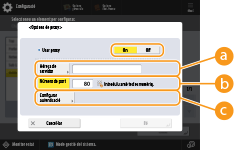 <Configurar autenticació>Premeu ací per configurar la informació d'autenticació quan s'utilitza la funció d'autenticació d'un servidor proxy. Premeu <On> a la pantalla mostrada, introduïu el nom d'usuari i la contrasenya per a l'autenticació del proxy i premeu <Acceptar>.