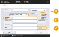 Pokud se pokusíte odeslat souborový server/Rozšířená schránka, v němž je <Potvrdit před odesláním> nastaveno na <Zap>, zobrazí se obrazovka s výzvou, abyste zadali uživatelské jméno a heslo. V takovém případě zadejte nastavené heslo. Chcete-li uložit souborový server / Rozšířená schránka do skupinové adresy, nastavte volbu <Potvrdit před odesláním> na <Vyp>. Nemůžete odeslat dokument na skupinovou adresu zahrnující souborový server/Rozšířená schránka, v němž je <Potvrdit před odesláním> nastaveno na <Zap>.