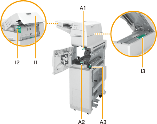 Luk papirstyret (I2) og det øverste dæksel (I1).